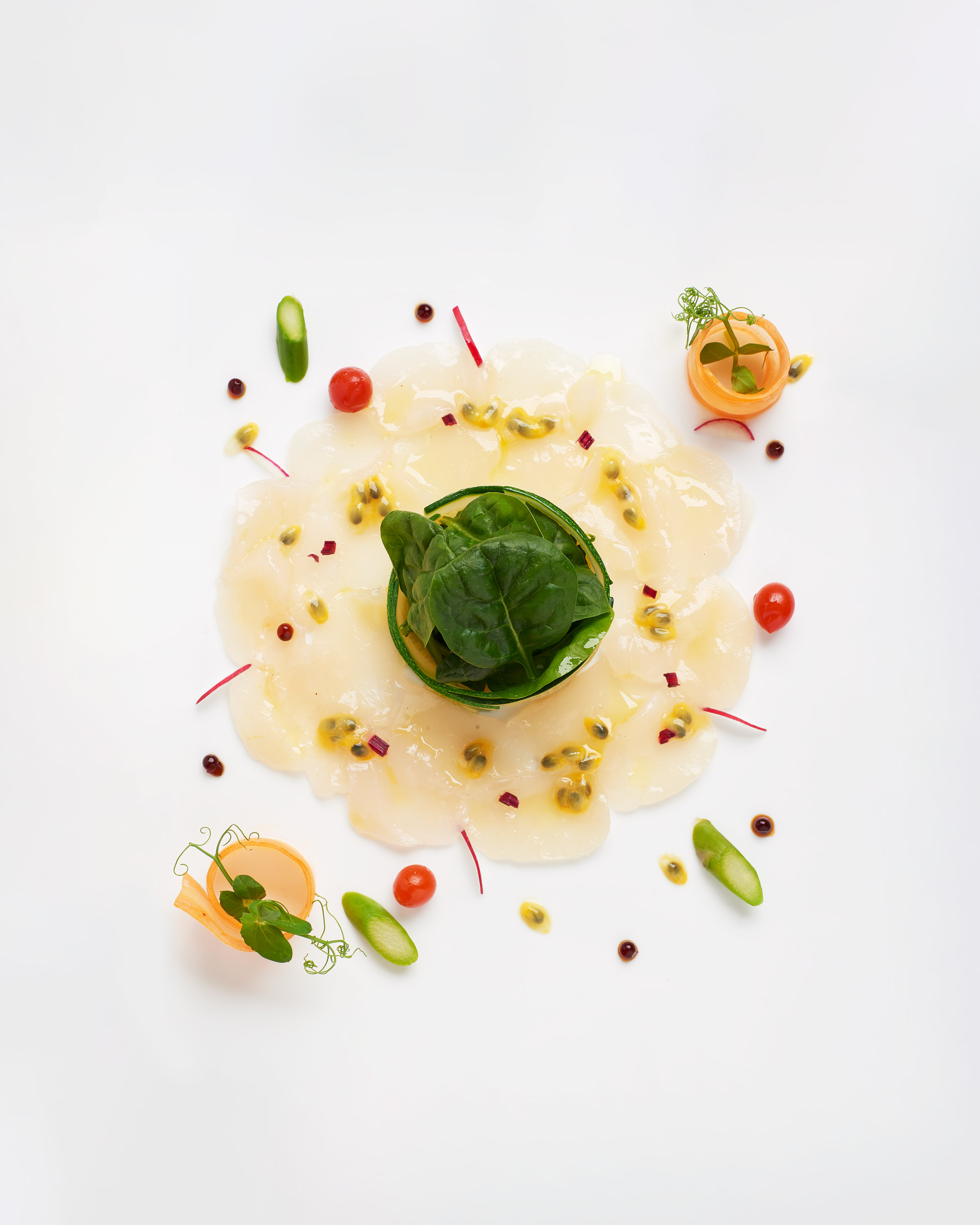 Chaque prise de vue a été réalisée avec une approche extrêmement minutieuse, pensée pour magnifier la composition, les textures et la palette chromatique des plats. Le travail de lumière a été ajusté à la finesse des produits afin de préserver le naturel des matières — nacré d’un poisson, moelleux d’une sauce, éclat d’une réduction ou tension des végétaux — tout en garantissant une restitution fidèle des volumes et des contrastes. Les cadrages sobres et précis ont été choisis pour renforcer la lecture du dressage et guider le regard vers l’essentiel : le geste du chef et la poésie de l’assiette.